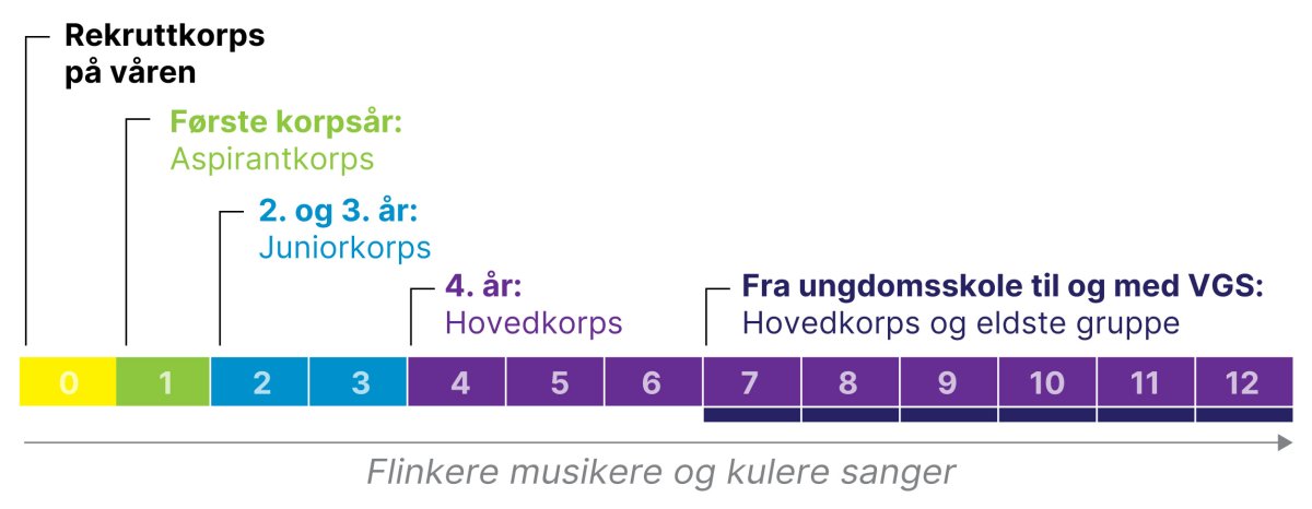 Opptak til korpset er vanligvis om våren for å sikre plass på kulturskolen til høsten. Korpset rekrutterer barn fra slutten av 1. klasse og oppover på alle skolene på Konnerud. De første årene er det fokus på musikklek og samspill. Etterhvert som man blir flinkere og eldre rykker man opp til neste korps hvor repertoaret blir vanskeligere, men også mer spennende.